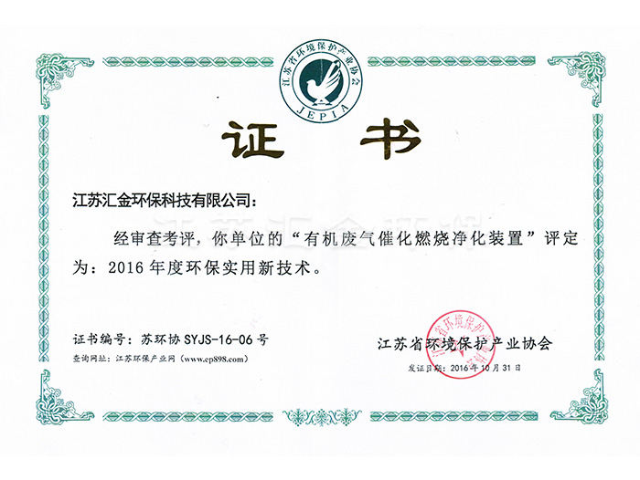 有機廢氣環(huán)保實用技術證書